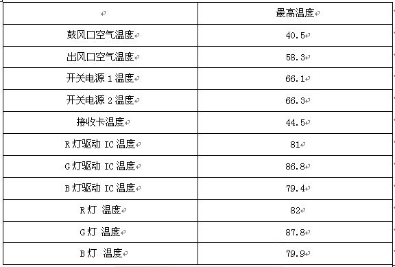 實驗溫度記錄表(單位℃,實驗條件:40℃高溫房,亮度12000nit,全白靜止畫面)